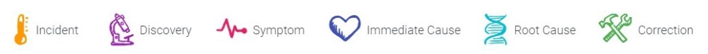 2. Create the following topic columns. The image at the top shows my column names, colors, and icons. Incident, Discovery, Symptom, Immediate Cause, Root Cause, Correction. Remember to leave room for 2 more columns. Notice that there is no column for “Who”.